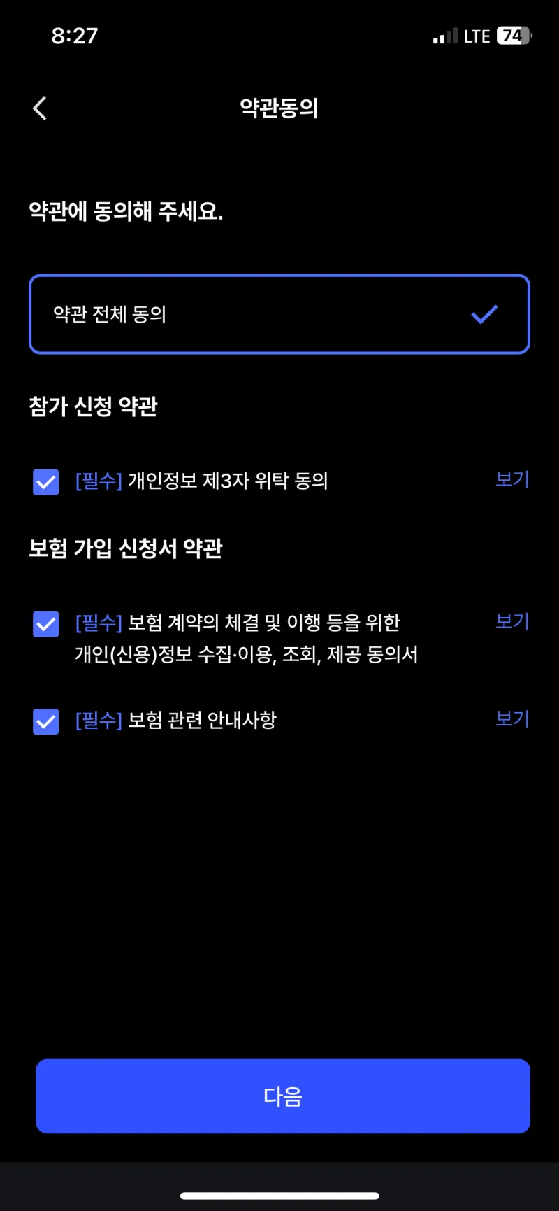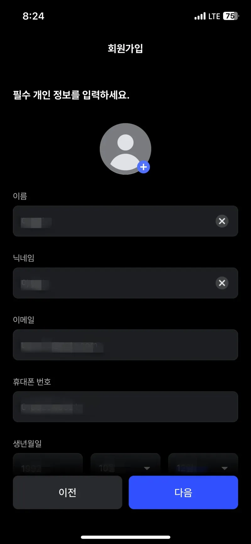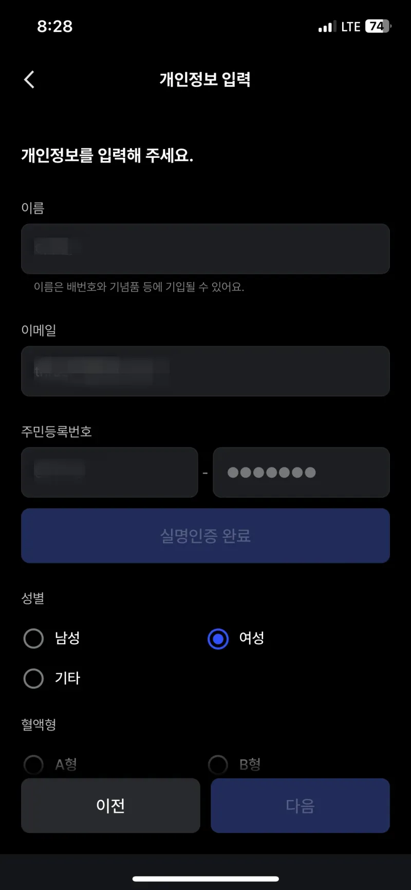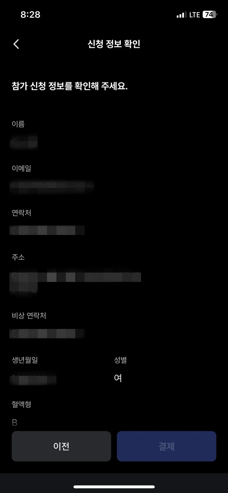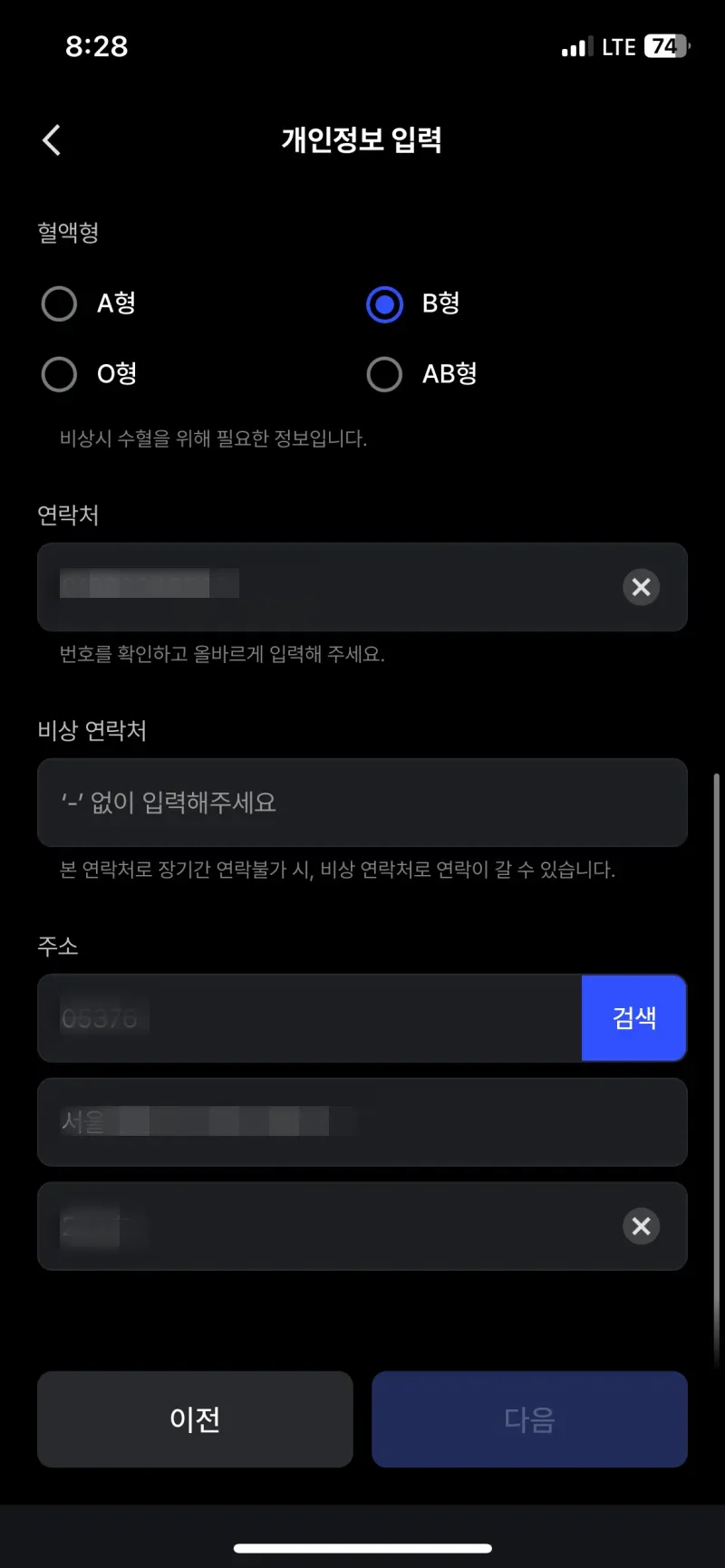 5. 개인정보와 혈액형, 주거지, 비상연락처 등을 입력해 주세요. 비상상황이 생기거나 보험 접수를 대비해 수집하는 정보입니다.