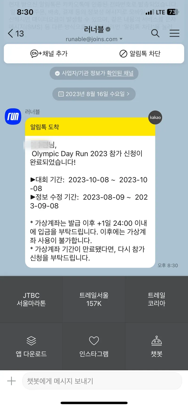 2023 올림픽데이런은 오직 '러너블' 어플을 통해서만 접수 가능합니다.