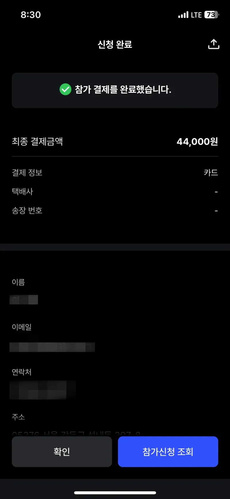 결제 완료 후에는 참가 신청 조회를 통해 제대로 접수가 되었는지 확인할 수 있습니다.