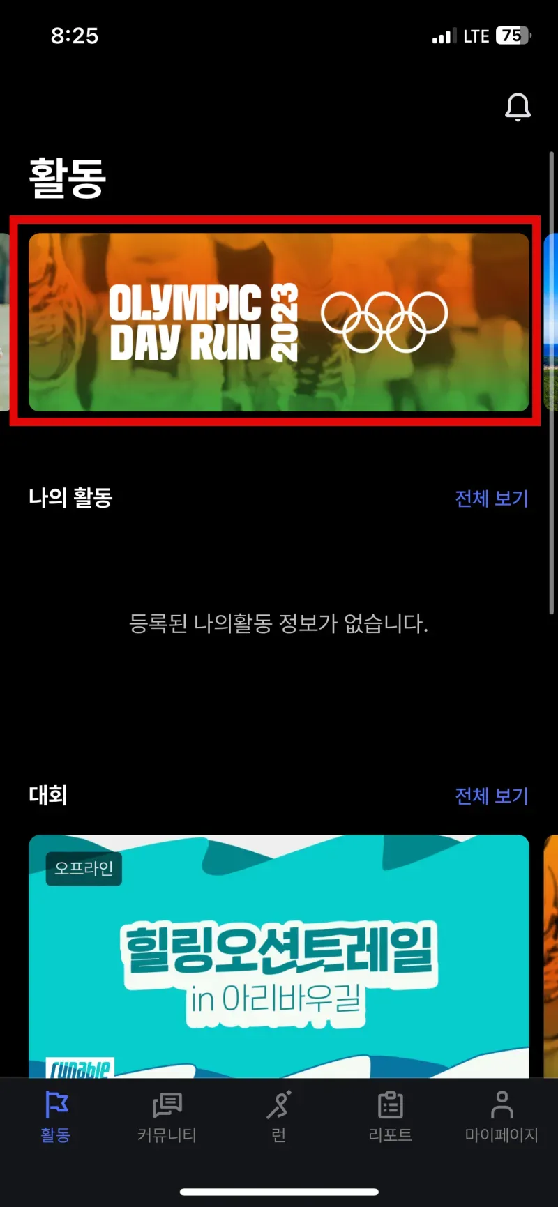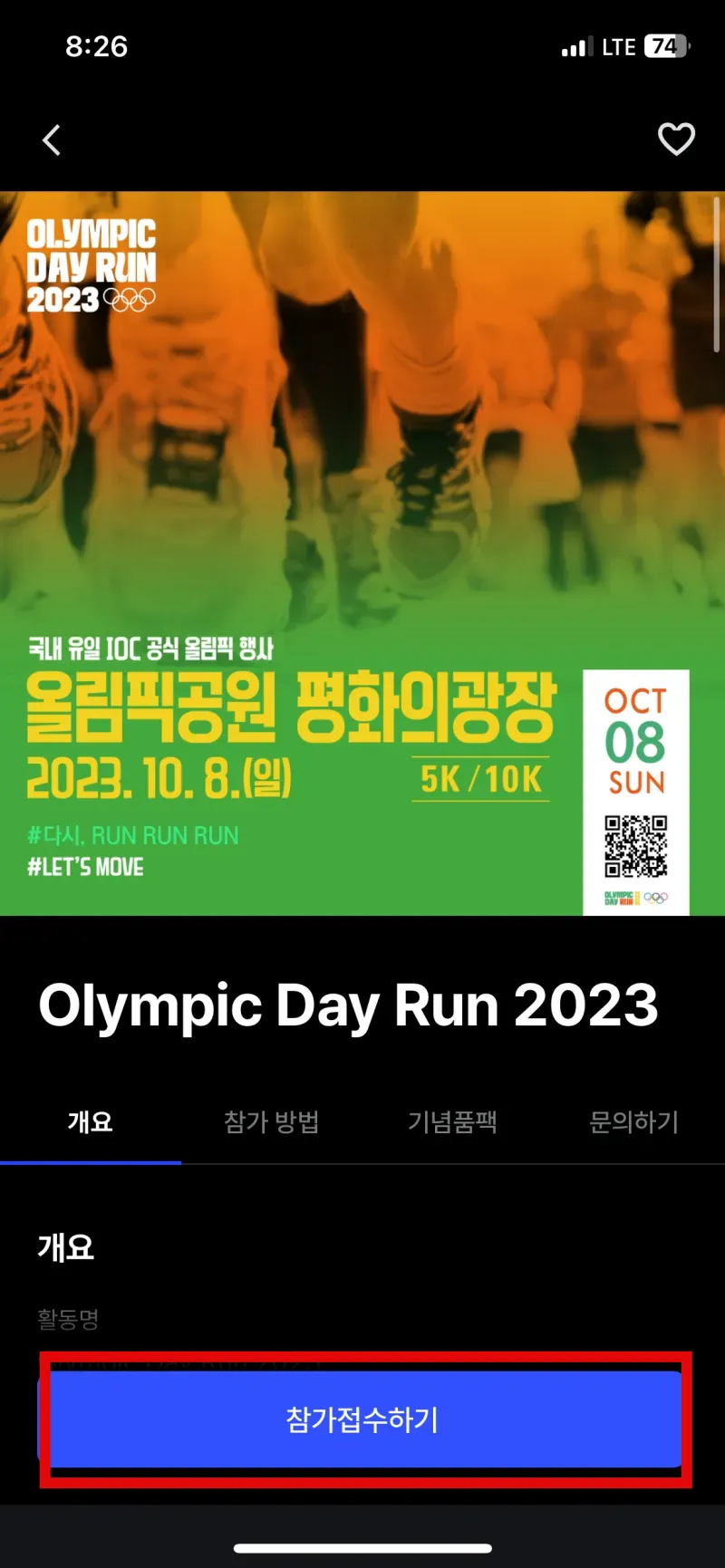 2. 로그인 후 메인화면에서 올림픽데이런 2023 배너를 선택한 후 참가 접수하기를 눌러주세요.